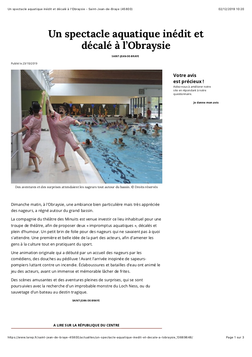 Photos du spectacle Représentation de La Piscine au Centre Aquatique de Pithiviers-27 mars 2015 [ngg src= »galleries » ids= »112″ exclusions= »1279,1280″ sortorder= »1269,1268,1270,1279,1271,1272,1267,1273,1274,1275,1276,1277,1280″ display= »basic_thumbnail » images_per_page= »20″] Représentation de La Piscine à l’Obraysie de Saint Jean de Braye-20 octobre 2019 [ngg src= »galleries » ids= »355″ display= »basic_thumbnail » override_thumbnail_settings= »1″]